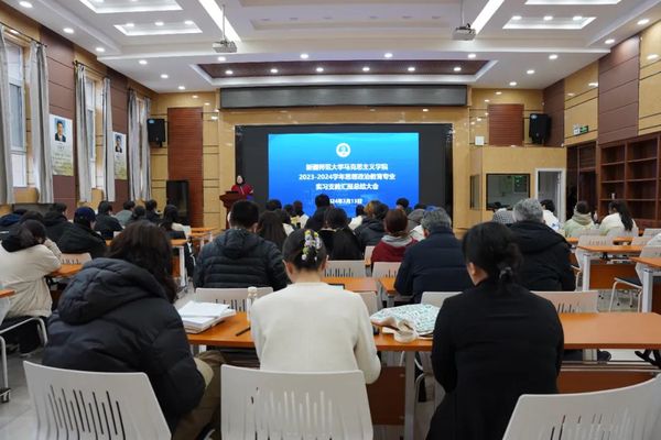 谢玲发言在汇报展示环节,8位实习支教学生代表依次分享实习支教期间的经历与心得。张哈尔·加思别克同学分享了在和田地区实习支教“身兼数职”但乐在其中的感悟;顾秋蕾同学以“四个月不长终生难忘”的感慨,向学校和实习单位提供的实习岗位与成长舞台表示感谢;姚伦明同学细数在第66中学实习期间的难忘小事;刘文珍同学分享了给学生过集体生日、临别收到学生惊喜留言的温暖时刻;吴嘉怡同学表示,实习支教的收获和成长也将成为自己不断前行的动力源泉。