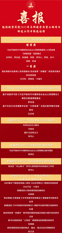 将以此次获奖为契机,持续培育高层次教学研究成果,坚持“以研促教、教研相长”,不断提升本科教学质量,为培养担当民族复兴大任的时代新人筑牢教学根基。期待全院教师在后续教育教学工作中再接再厉,再创佳绩!