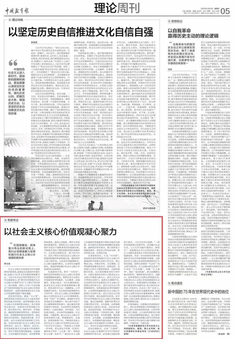 社会主义核心价值观是当代中国精神的内核体现,是建设文化强国的价值引领,是践行习近平文化思想的重要着力点。习近平总书记对宣传思想文化工作作出重要指示,将“着力培育和践行社会主义核心价值观”作为“七个着力”的内容之一加以强调。党的二十届三中全会提出“完善培育和践行社会主义核心价值观制度机制”。这都为继续推进社会主义核心价值观教育提供了根本遵循。