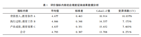 从整体数据来看,平均值为4.793,Cohen's d值13.708,变异系数8.271%,表明评价体系获得了各层面专家的普遍认可且意见具有较高的一致性。“执行过程:教育工作B、产出成效:教育效果C”数据表明,专家对指标内容的合理度认可具有高度的共识。“背景投入:教育条件A”的平均值为4.677,Cohen's d值(10.914)相对较低,且变异系数(10.037%)最高,反映出专家对教育条件类指标的意见相对分散,需要进一步修订和优化指标内容。结合专家意见,修订整合含义相近指标,剔除冗余指标,增加负向指标内容。