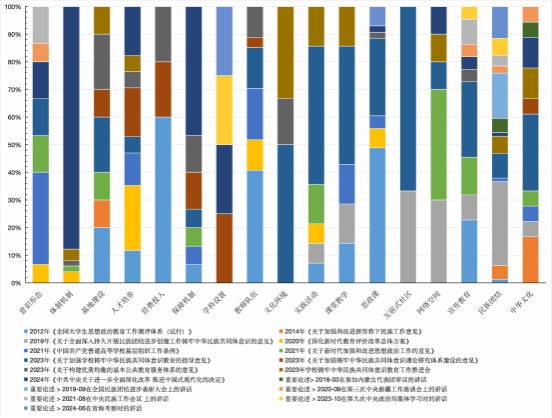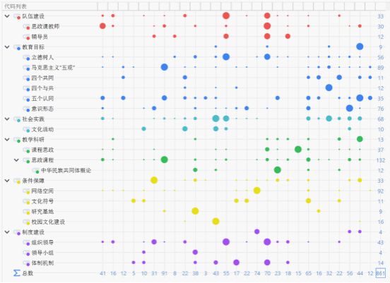 为系统性验证“铸牢中华民族共同体意识”在习近平总书记重要论述和纲领性政策文本中的相关要素,本研究采用质性分析软件MAXQDA24.7作为研究工具。以铸牢中华民族共同体意识为历史脉络,经过严格筛选,选出6篇重要论述、10份主要政策文本和1个有关铸牢中华民族共同体意识教育推进会内容。同时,为了确保主题编码选取时不偏离、不脱离思想政治教育评价体系,引入2012年教育部发布的《全国大学生思想政治教育工作测评体系(试行)》普通高等学校测评体系和2020年国务院印发的《深化新时代教育评价改革总体方案》,确保研究的科学性、规范性和全面性。通过对涉及铸牢中华民族共同体意识的各文本段落内容分类编码,经过提炼和归纳,共生成344条采样片段,17个具有代表性和概括性的主题要素,视图如下(图2)。