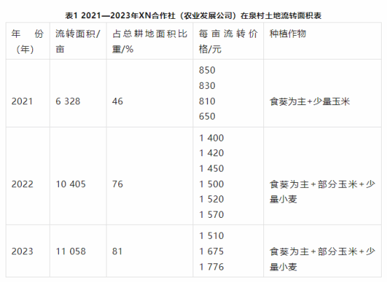 2018年以前,泉村已经开始出现承包大户,承包面积在100亩到200亩之间,每亩地承包费在100元到400元之间。这些大户大多是本村少数富裕农民和部分中等收入农民,他们在积累了一定资本后开始逐渐扩大规模。2018年,本村富裕农民秦某结识了四川、陕西的食葵种植老板,邀请这些食葵种植老板到泉村投资,拉开了资本经营的序幕。当年,本地大户与外地老板承包的规模占总面积的17%,承包比重不算太大。但种植食葵这件事验证了泉村有适合种植食葵的气候条件,并且可以获得一定收益。2021年,XN合作社以本地农业发展公司为依托进入泉村开展超大规模的土地流转,由最初流转的6 238亩发展到11058亩,流转面积占总面积的81%,泉村也实现了整村流转。