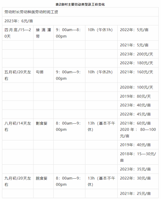 2021年至2023年,泉村的土地流转价格也由每亩650—850元,增长到每亩1510—1776元,以大规模种植食葵为主(见表1)。而食葵作为一种高度市场化的经济作物,属于资本和劳动力双密集的作物。尤其在采收过程中需要全部使用人工完成。这就导致外来资本进入泉村规模化种植食葵时,需要使用大量劳动力。本地农民逐渐脱离农业生产进入劳动力市场成为农业雇工。